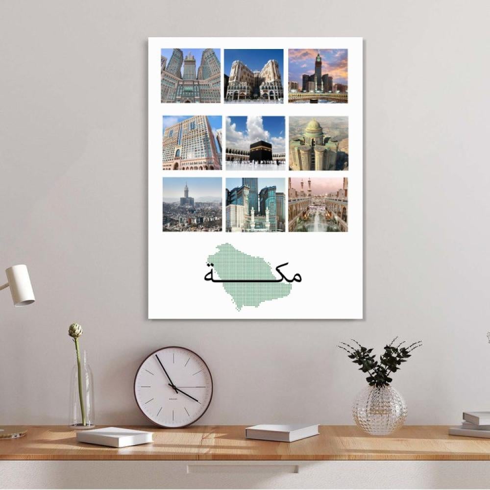 معالم مكة, اجعل جدران منزلك تحكي قصة الأصالة والروحانية مع لوحة قماشية بتصميم معالم مدينة مكة، تأتي بتصميم عصري وأنيق يجمع بين الجمال الفني والرمزية العميقة، ليضفي على مساحتك لمسة فريدة تعكس مكانة مكة المباركة.